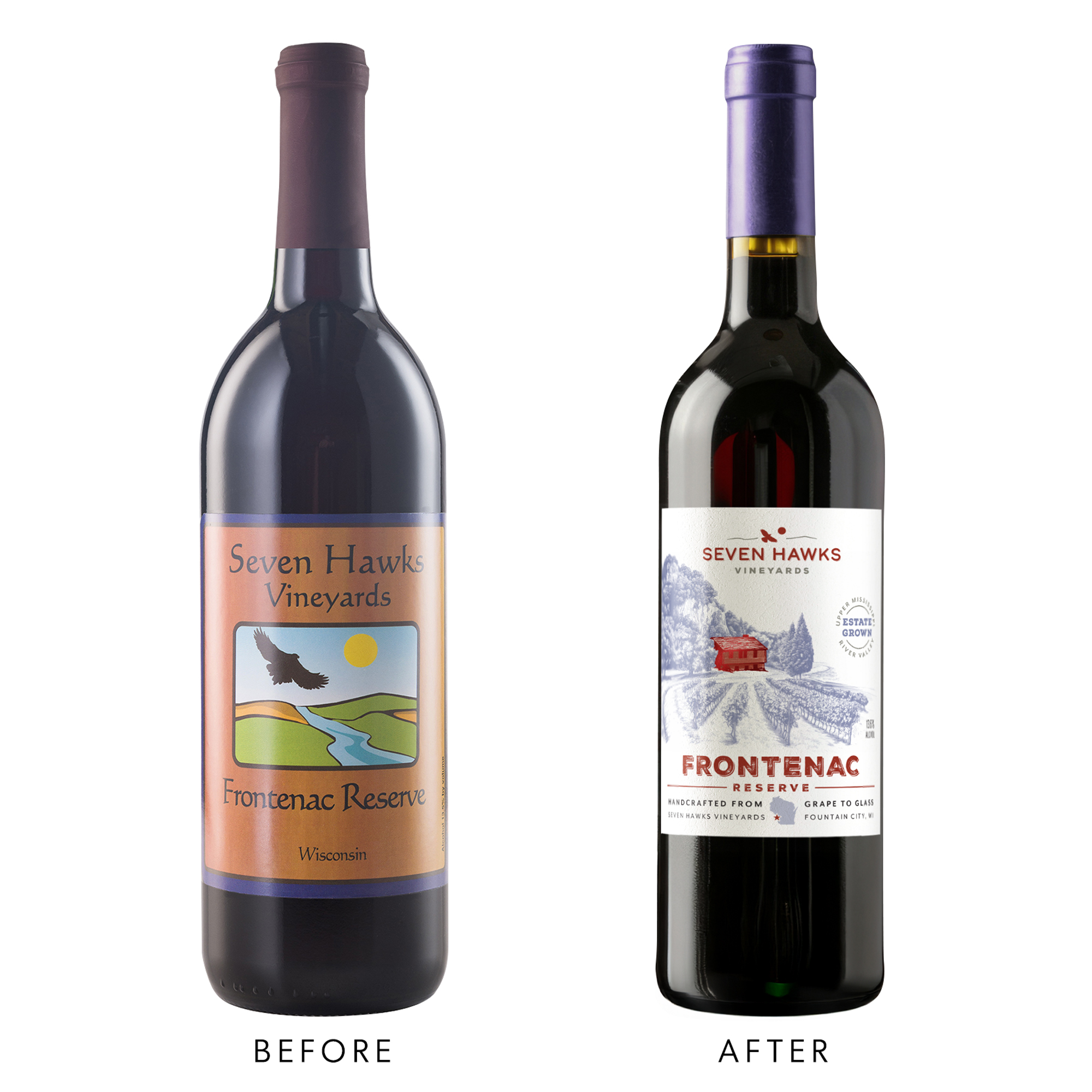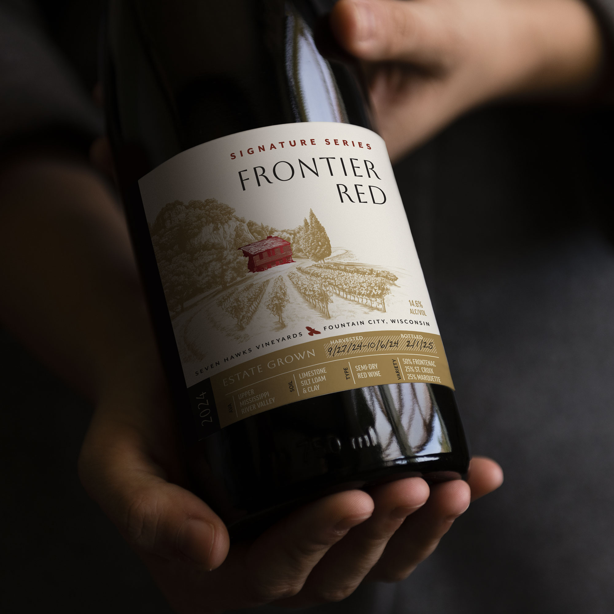 We’re proud to have partnered with Seven Hawks Vineyards on a full redesign for their Signature Series wine labels. The updated design brings a sense of place to the forefront – highlighting the Mississippi River Valley bluffs and the winery’s iconic red barn, now accented in elegant red foil across the series.