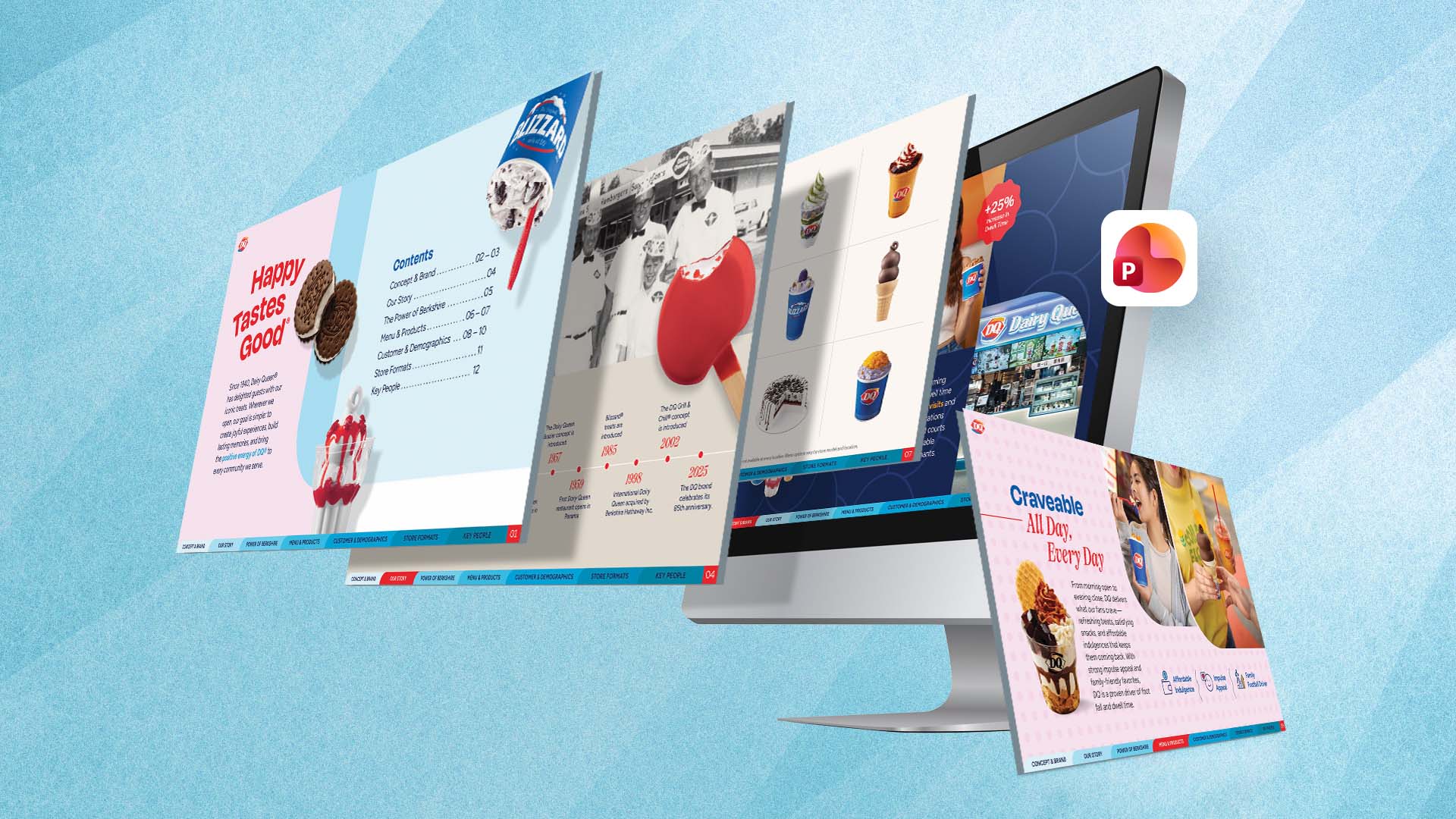 To help Dairy Queen expand into key international markets, we developed a custom PowerPoint experience tailored for a global audience. The presentation introduces a refined brand look that resonates across cultures while maintaining core brand equity. Designed for self-guided viewing, it works seamlessly as both an interactive presentation and a polished, e-mailable PDF. Built-in flexibility allows end users to easily update key data, messaging, and imagery—ensuring the content stays relevant, localized, and persuasive wherever it’s used.